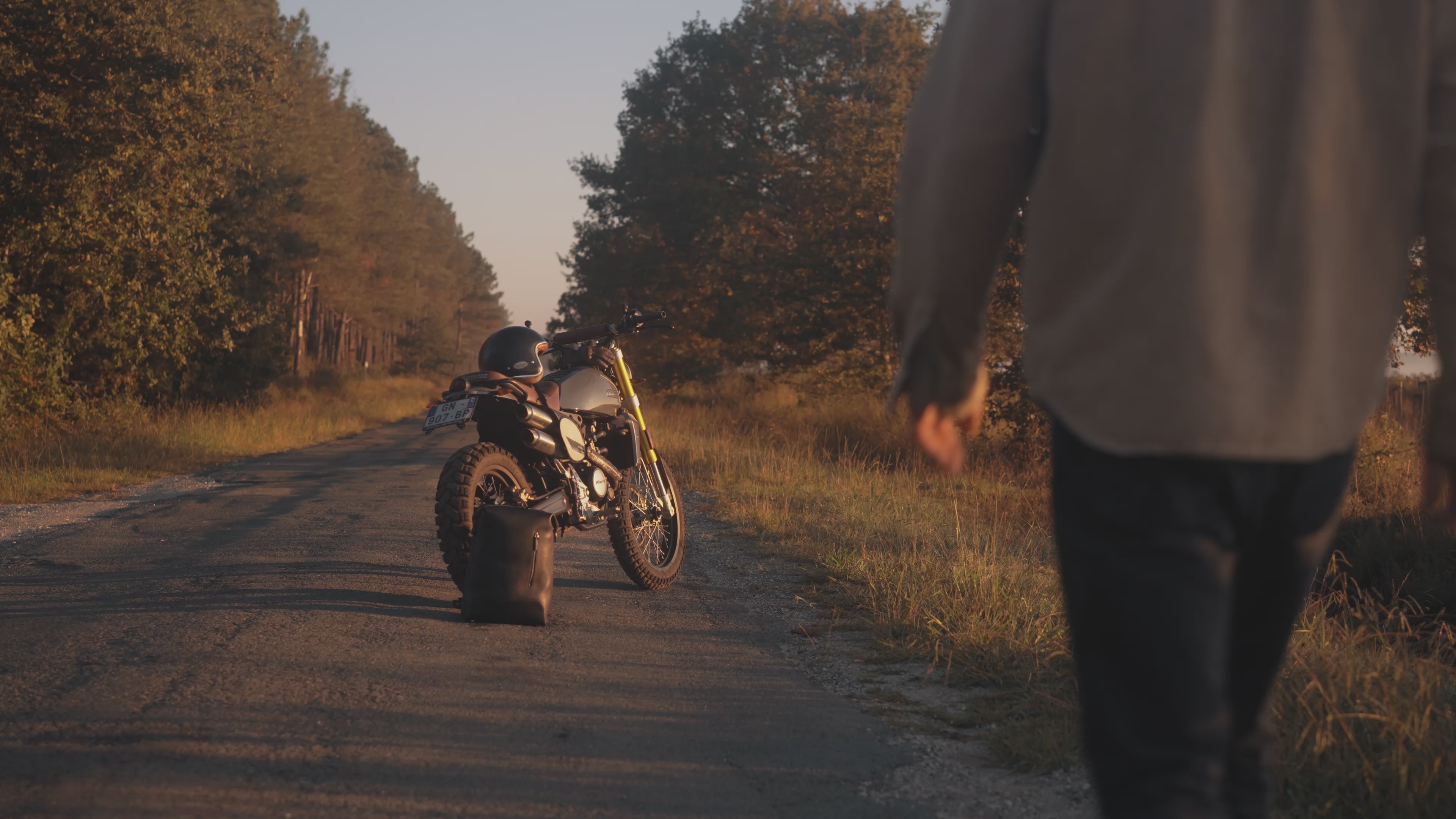 Sur une petite route de sable et de pins, un moteur s’éveille. Le bruit d’un scrambler vient troubler le silence, régulier, presque apaisant. L’homme ajuste son casque, remet son sac à dos en cuir sur l’épaule, et s’élance.
