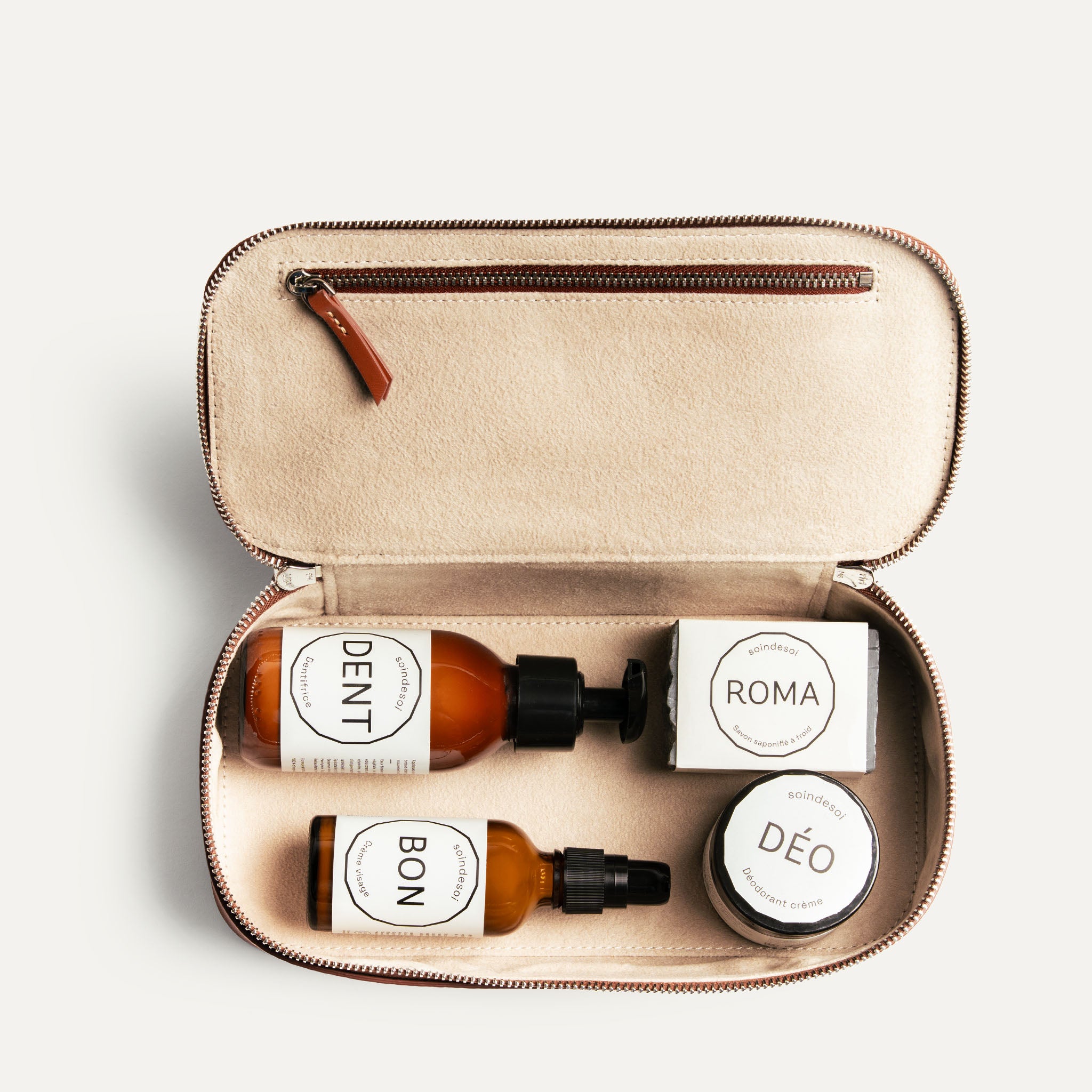 Immerse yourself in a skincare routine designed for today's man, where elegance and naturalness meet. The Soin de Soi × lundi pack combines a leather toiletries bag—grained or smooth, available in four refined colors—with organic skincare products for men designed to last and enhance your daily routine.