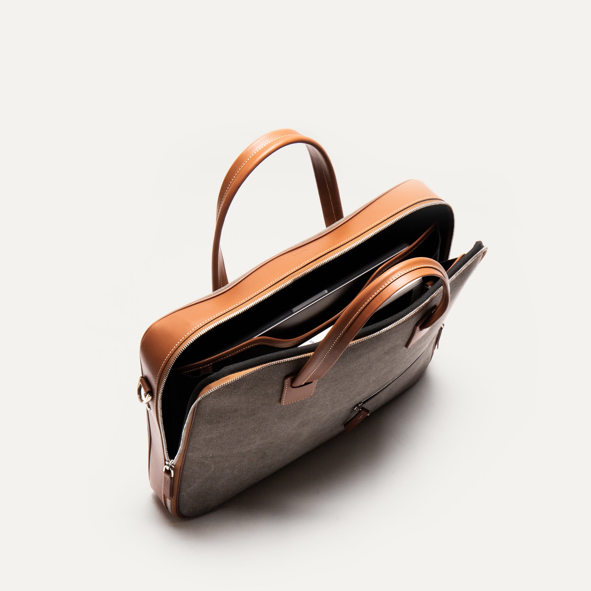 The combination of the grey of our oiled cotton canvas with our cognac leather gives a real touch of originality to this briefcase which will become the ideal companion for your professional trips. A very compact format that is full of storage solutions and the materials used have also been chosen for their quality and resistance, like the Neoprene pockets that will accommodate your most fragile objects.