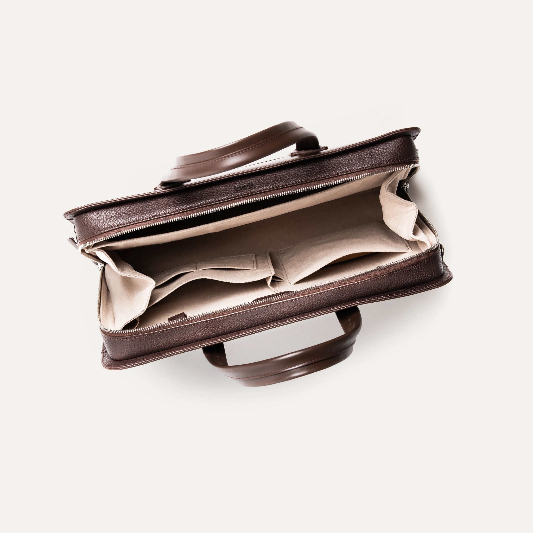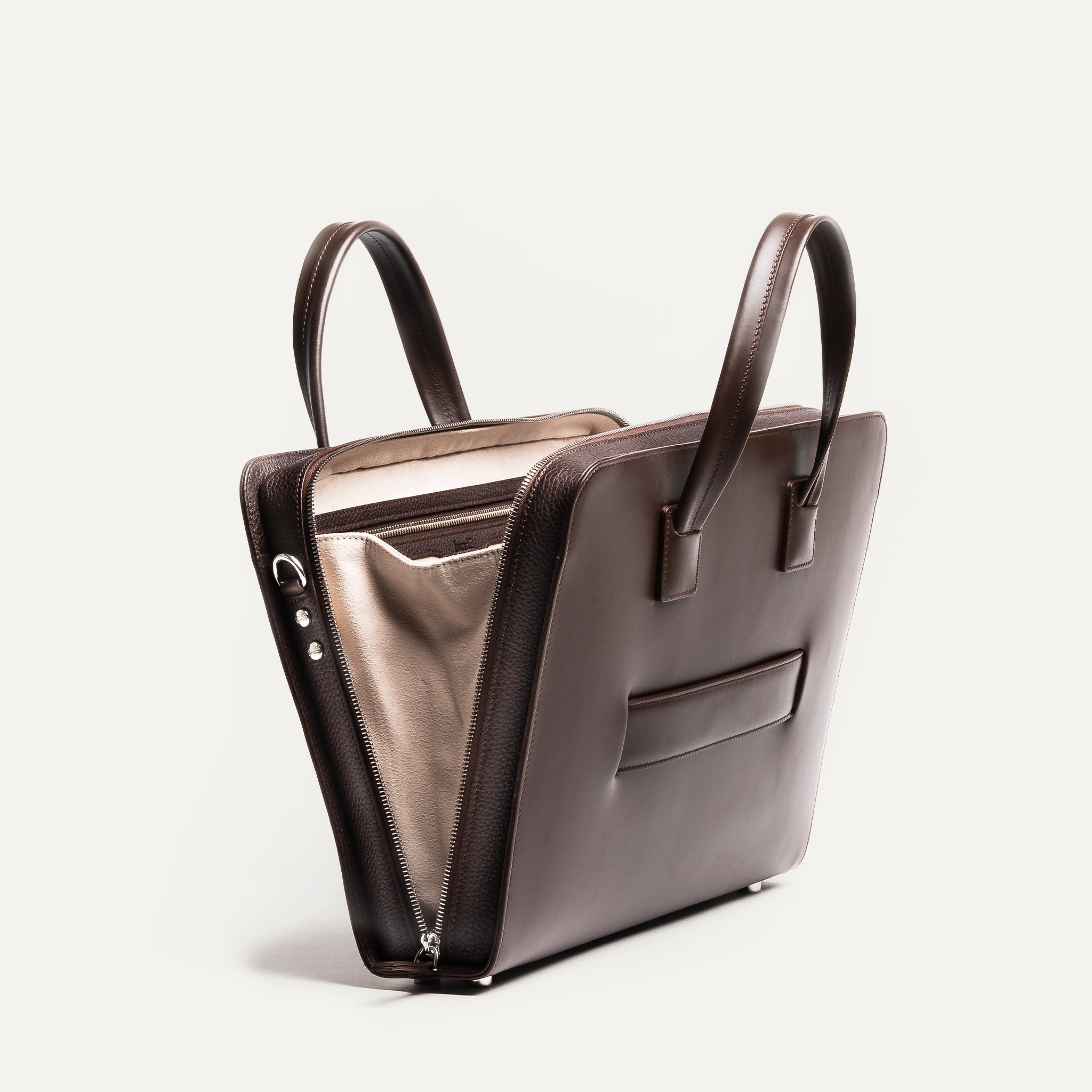 Inside, the Alcantara lining wraps your essentials in a soft yet durable material: laptop, documents, notebook, charger. Every item finds its place through a clear, intuitive layout.