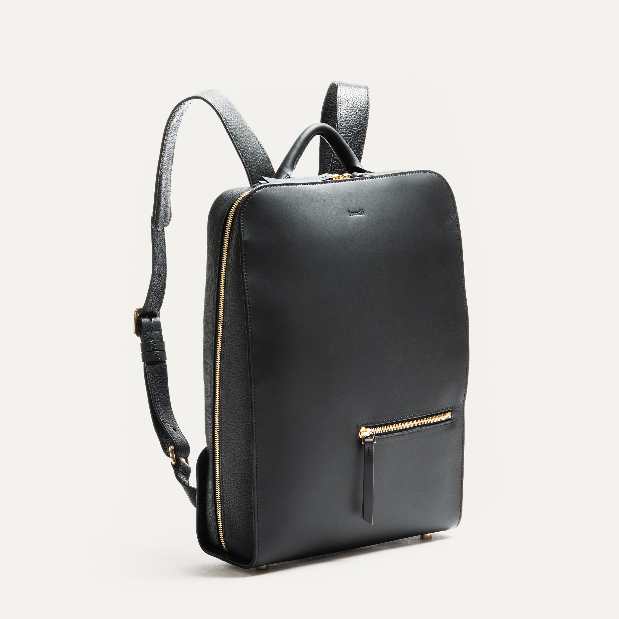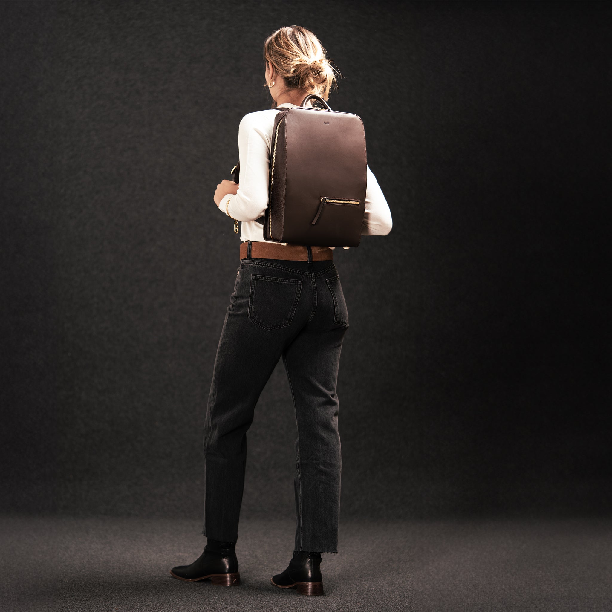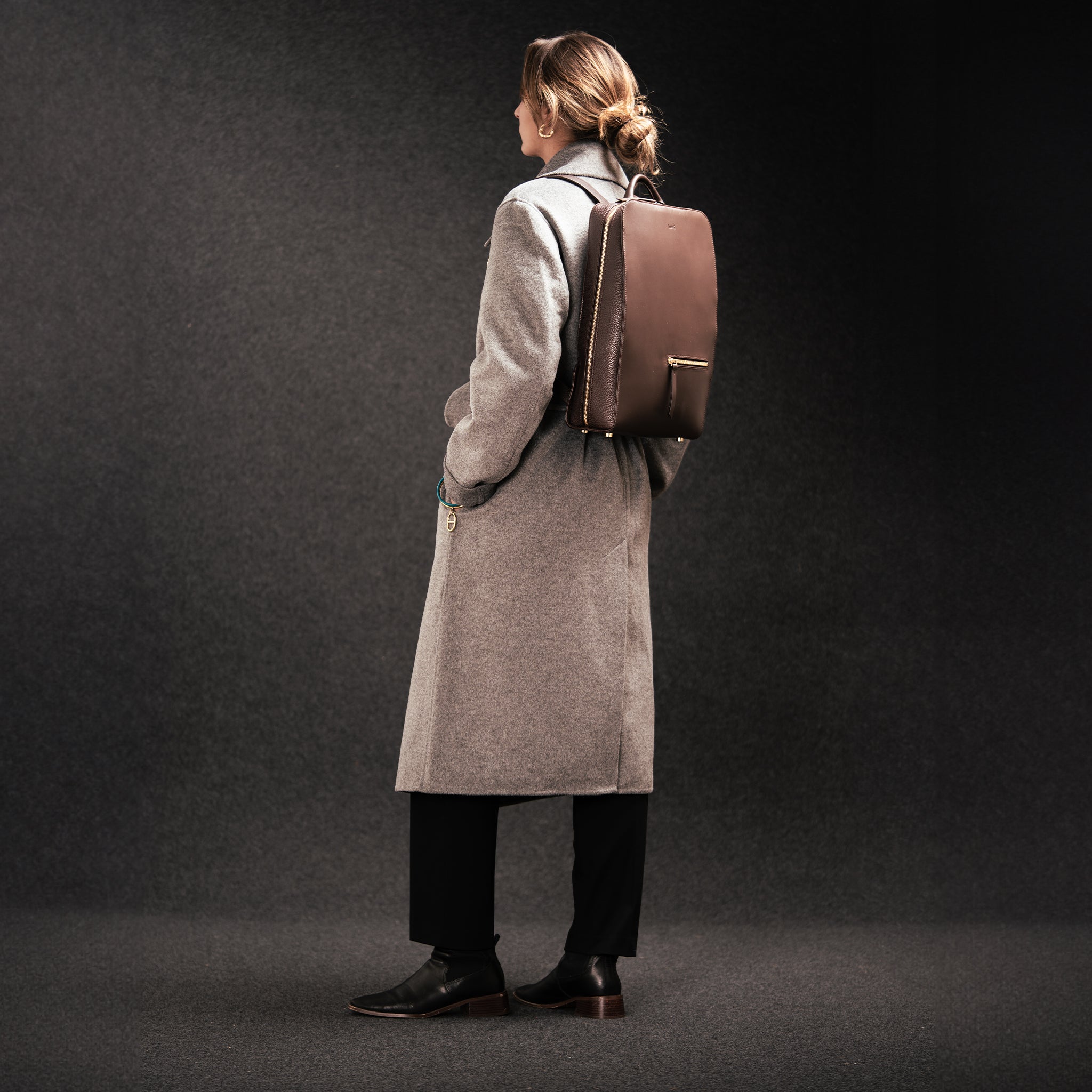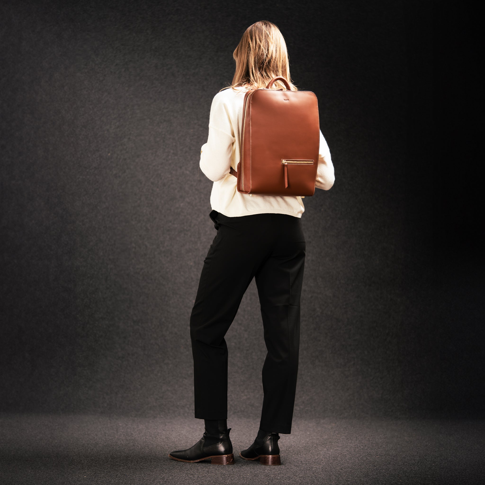 The Chiara backpack is an integral part of our women’s line, which also includes the Emy tote, Lena briefcase, and Stella wallet. It is available in black, brown, and cognac.