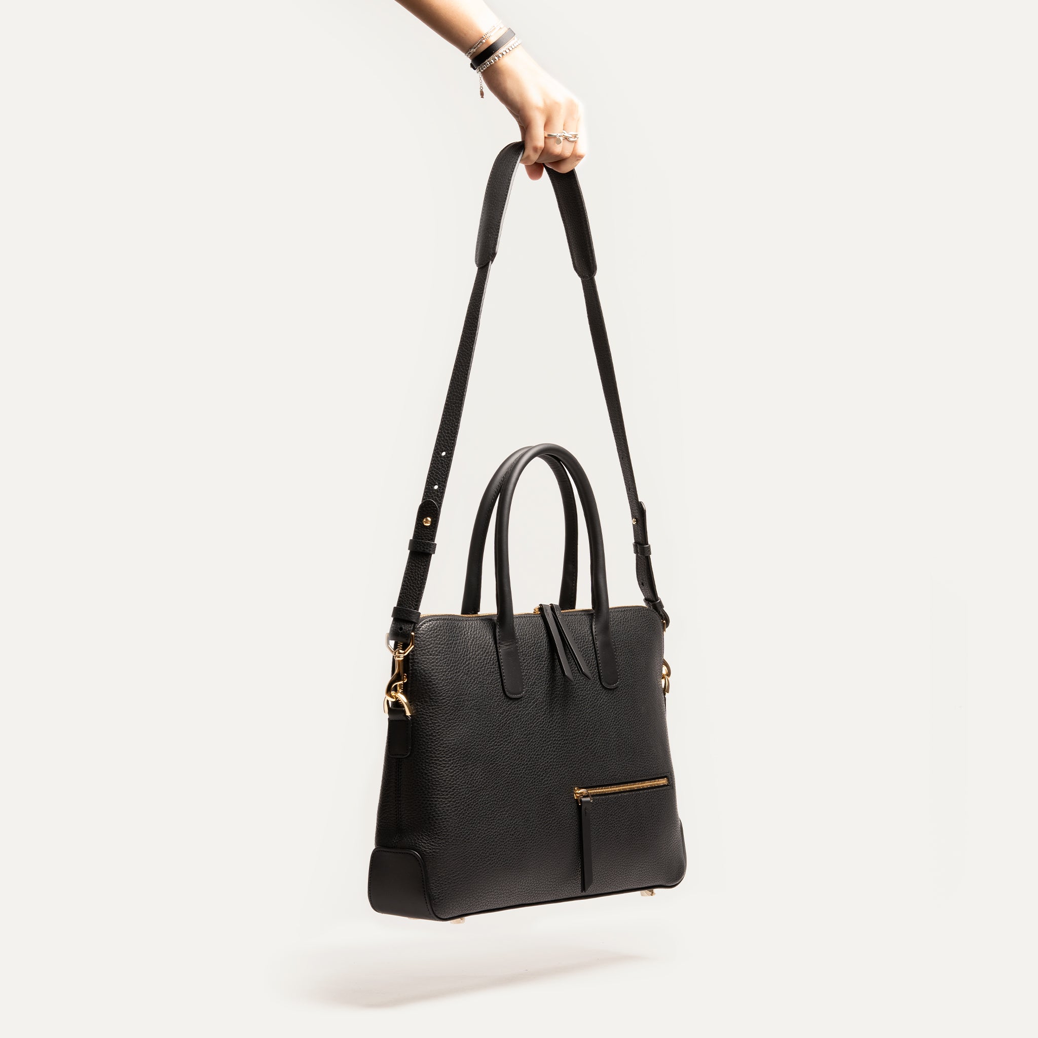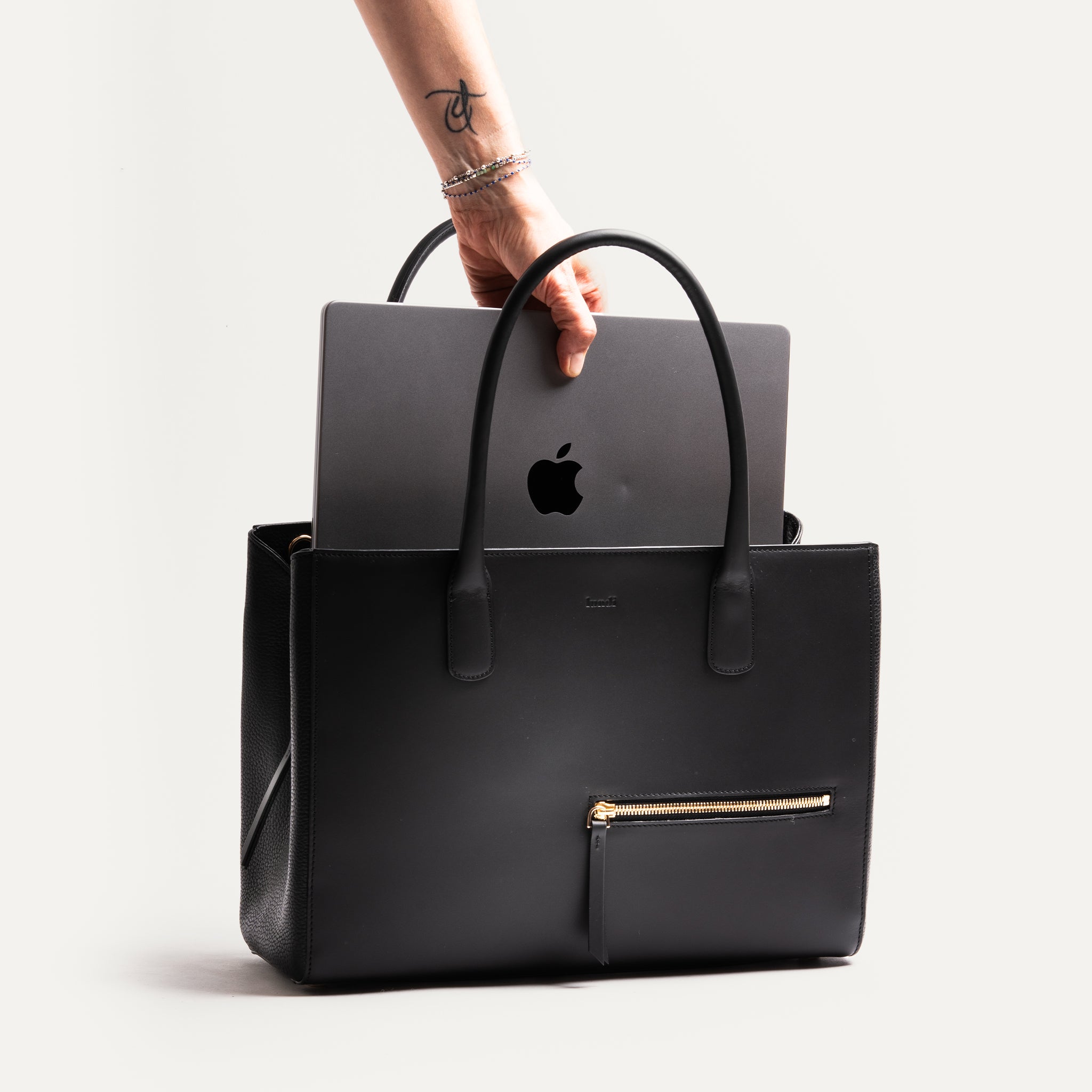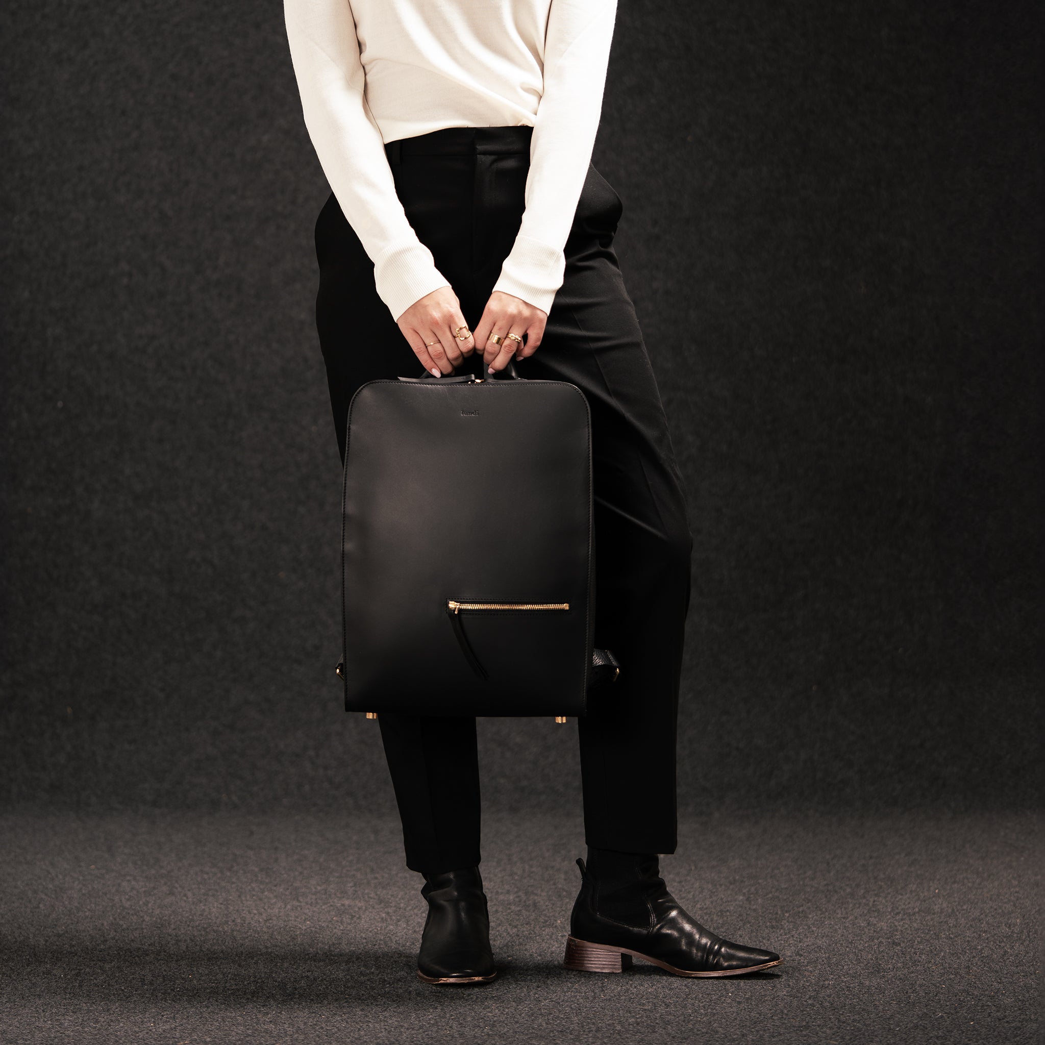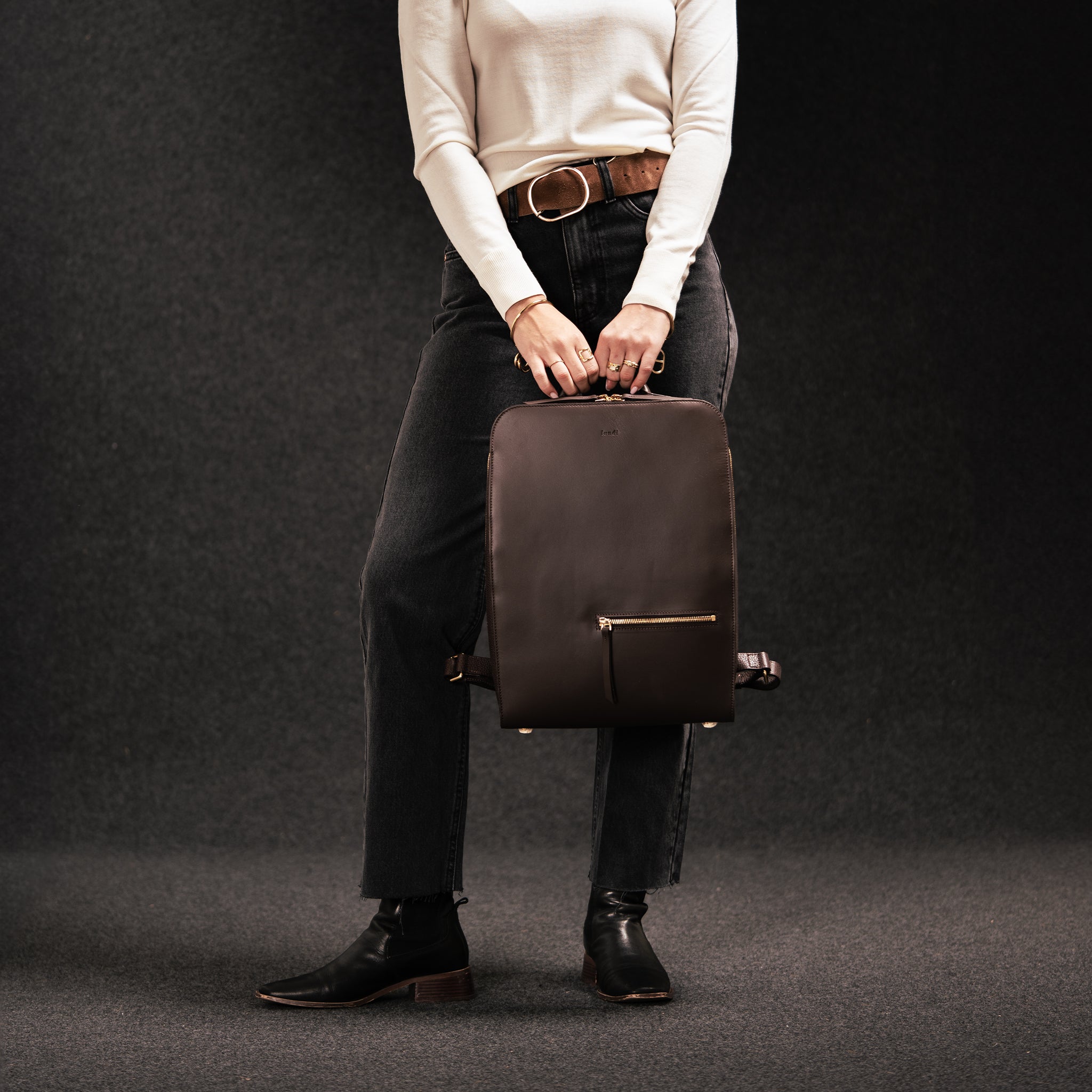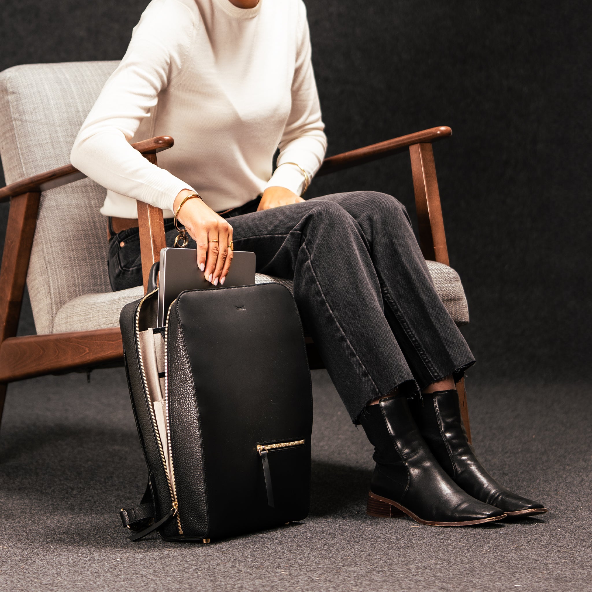 The Chiara backpack is an integral part of our women’s line, which also includes the Emy tote, Lena briefcase, and Stella wallet. It is available in black, brown, and cognac.