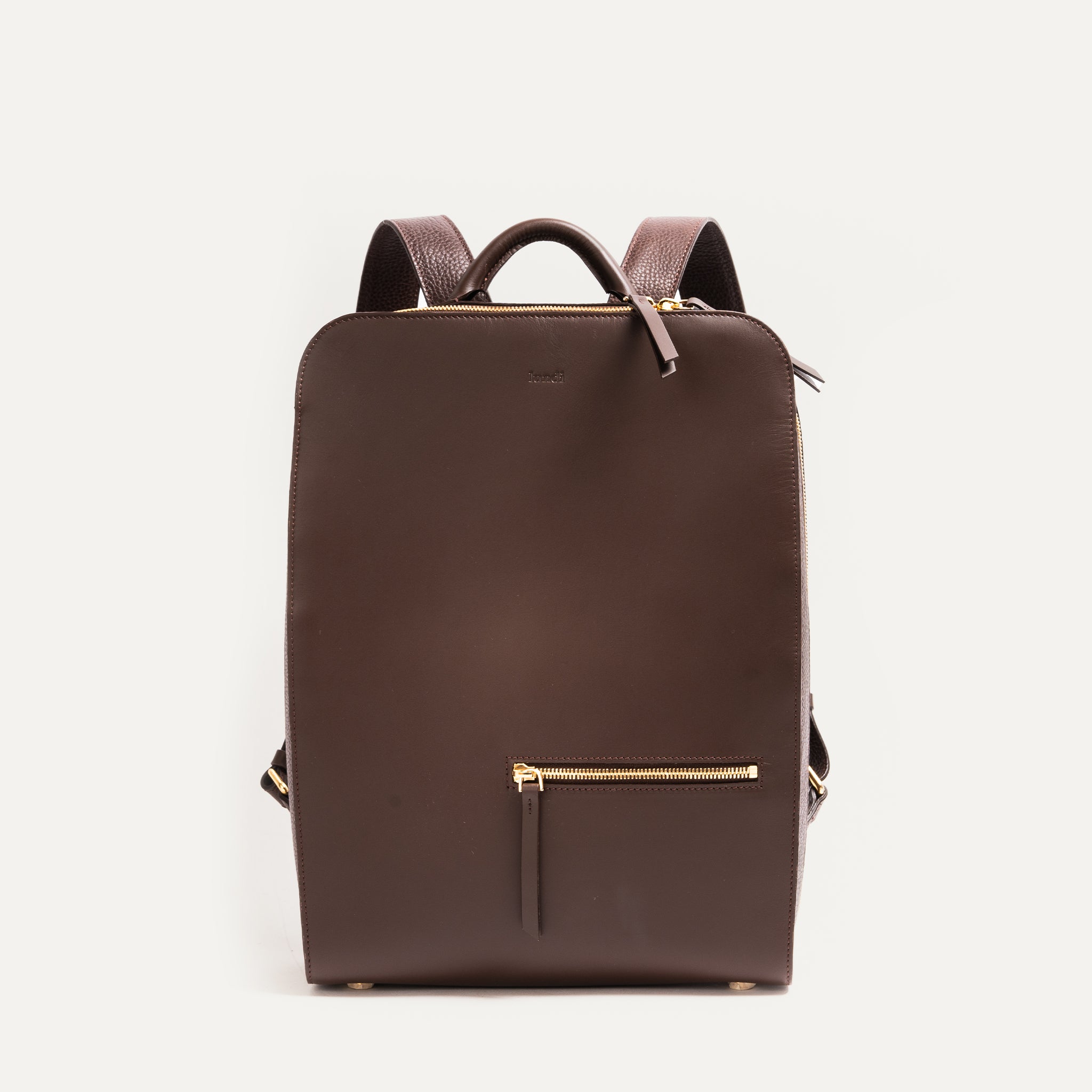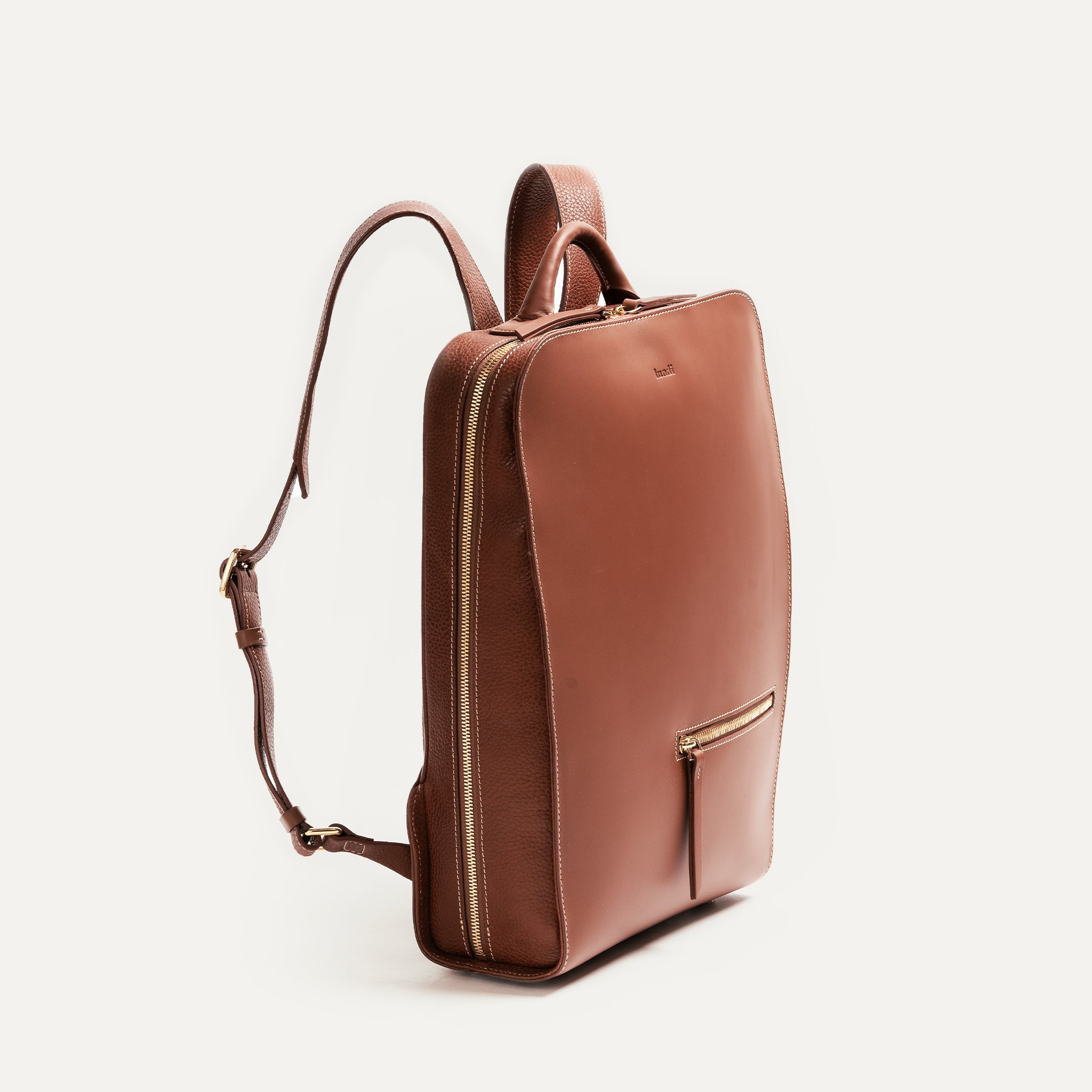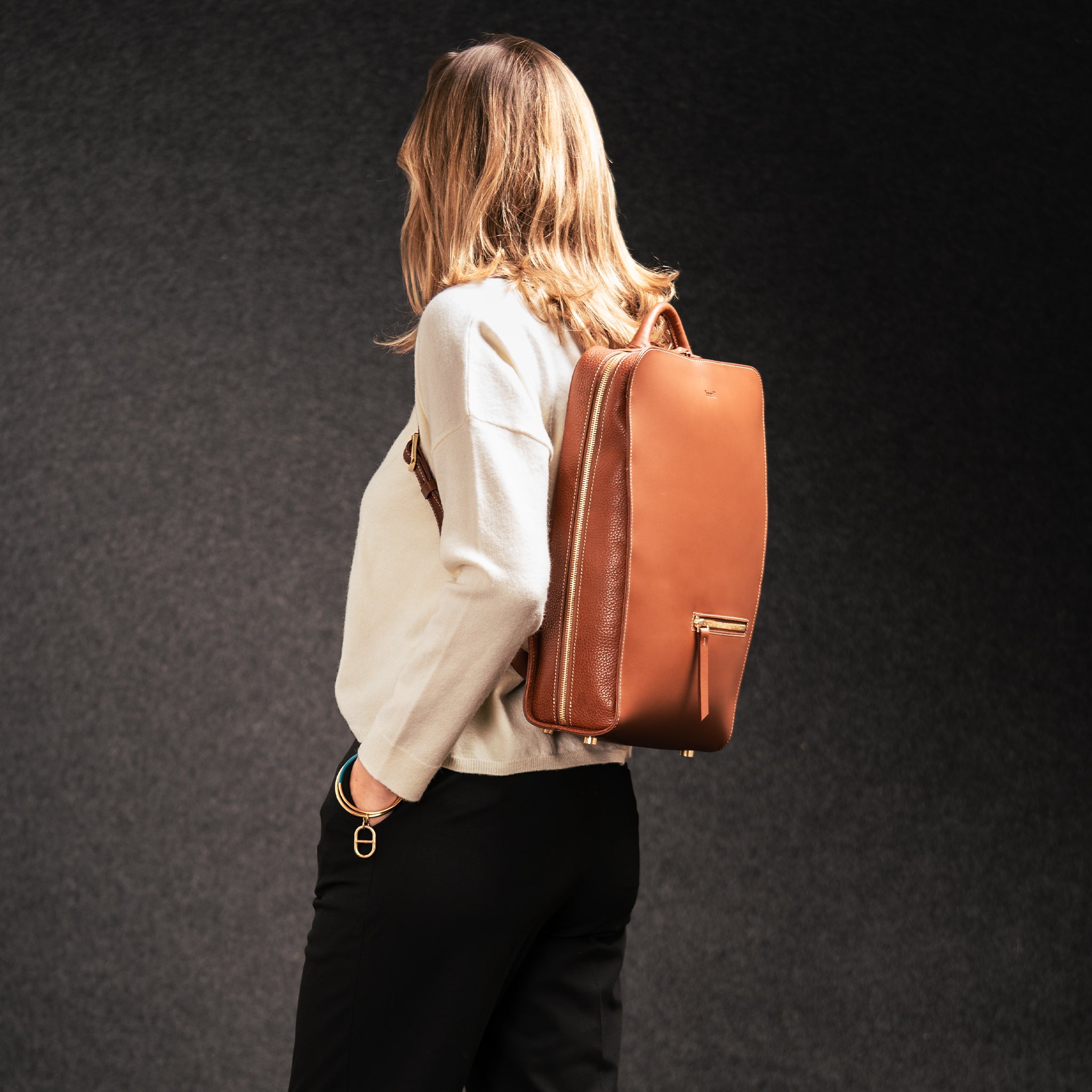 Created by our design studio, the Chiara backpack harmoniously combines functionality and aesthetic appeal. Every detail is crafted to meet the needs of an active woman who appreciates minimalist and timeless design. It pairs our smooth and grained leather, both naturally tanned, and features golden metal hardware for a sophisticated touch.