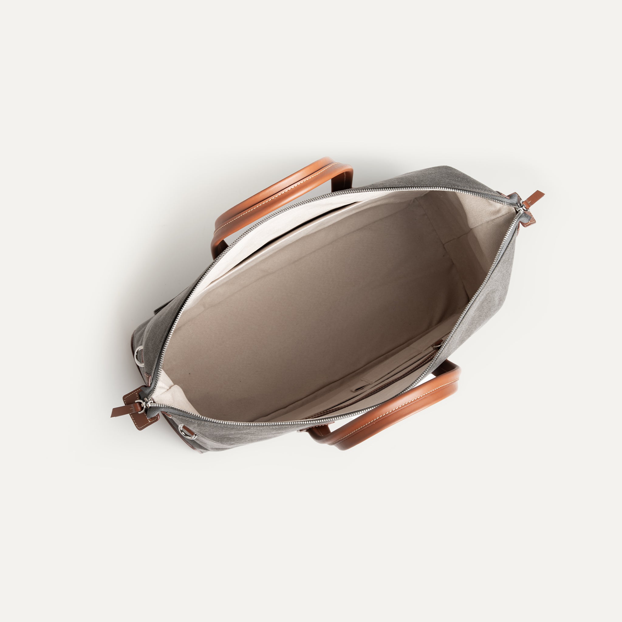 Confectionné en toile de coton grise au traitement déperlant et en cuir lisse cognac au tannage semi-végétal, l'Augustin conjugue souplesse, durabilité et caractère intemporel. Le cuir cognac développe avec le temps une patine unique et naturelle — faisant de chaque sac une pièce singulière, à votre image.
