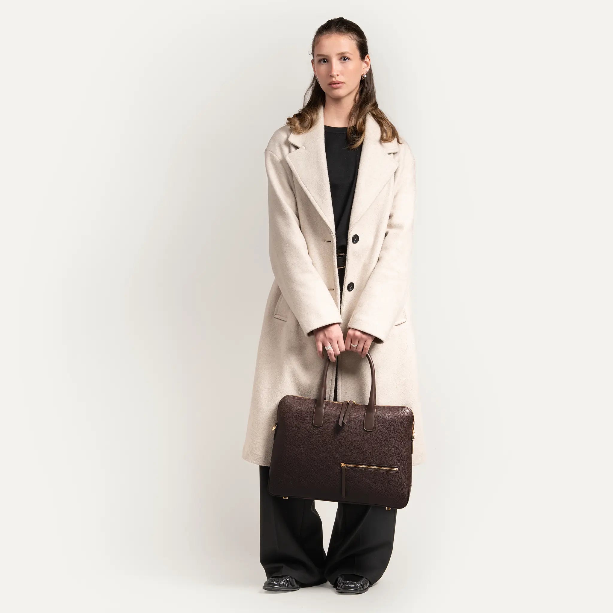 Le porte-documents LENA en cuir pleine fleur marron mêle harmonieusement cuir grainé et lisse pour une allure raffinée et intemporelle. Conçu pour accompagner les femmes actives, il associe fonctionnalité et style en toute discrétion.