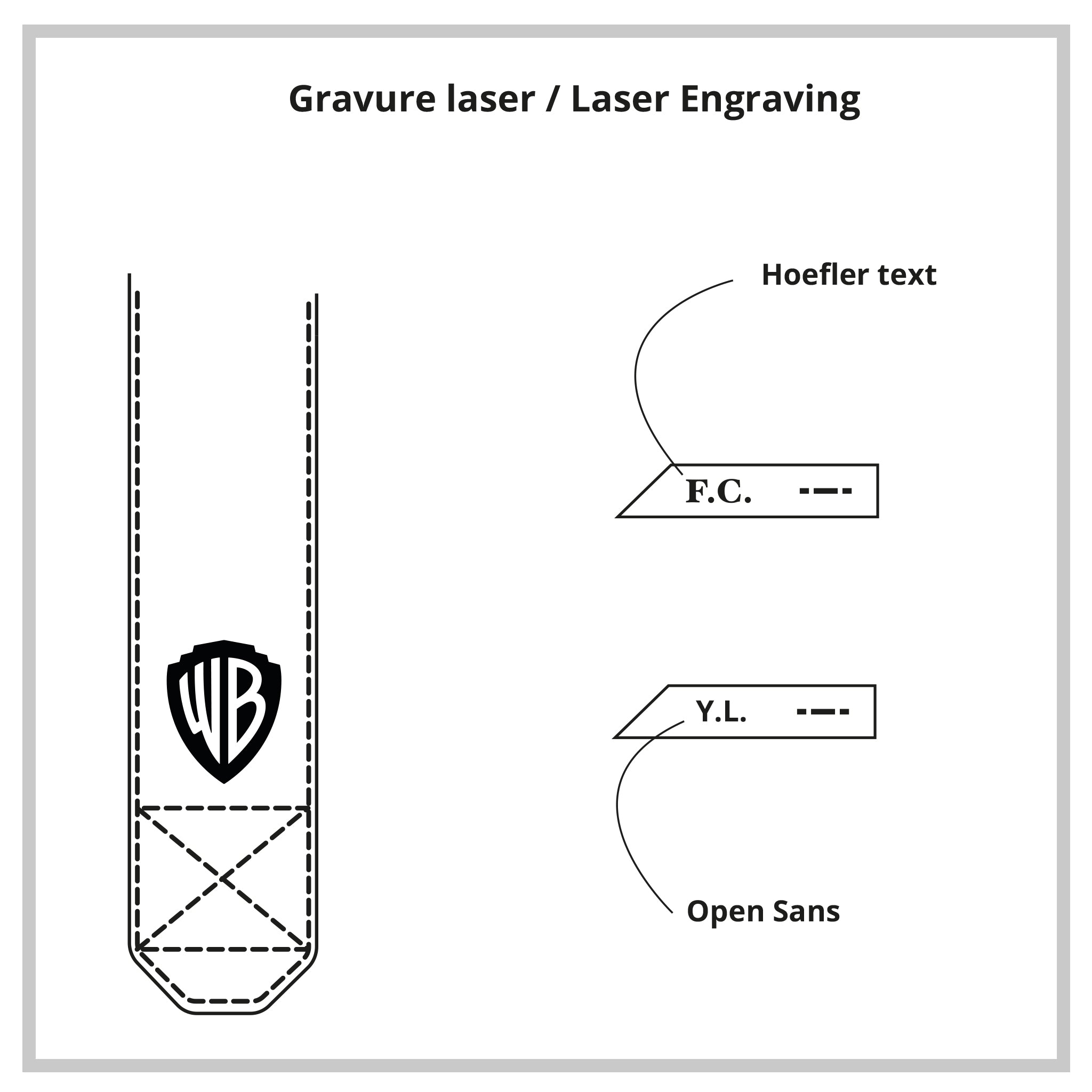 Nous pouvons utiliser n’importe quelle typographie de votre choix. Si vous n’avez pas d’idée, nous pouvons bien entendu vous faire des propositions. Nous pouvons également graver tout type de logo ou autre dessins, n’hésitez-pas à nous en faire la demande. Notre studio de création est à votre écoute.