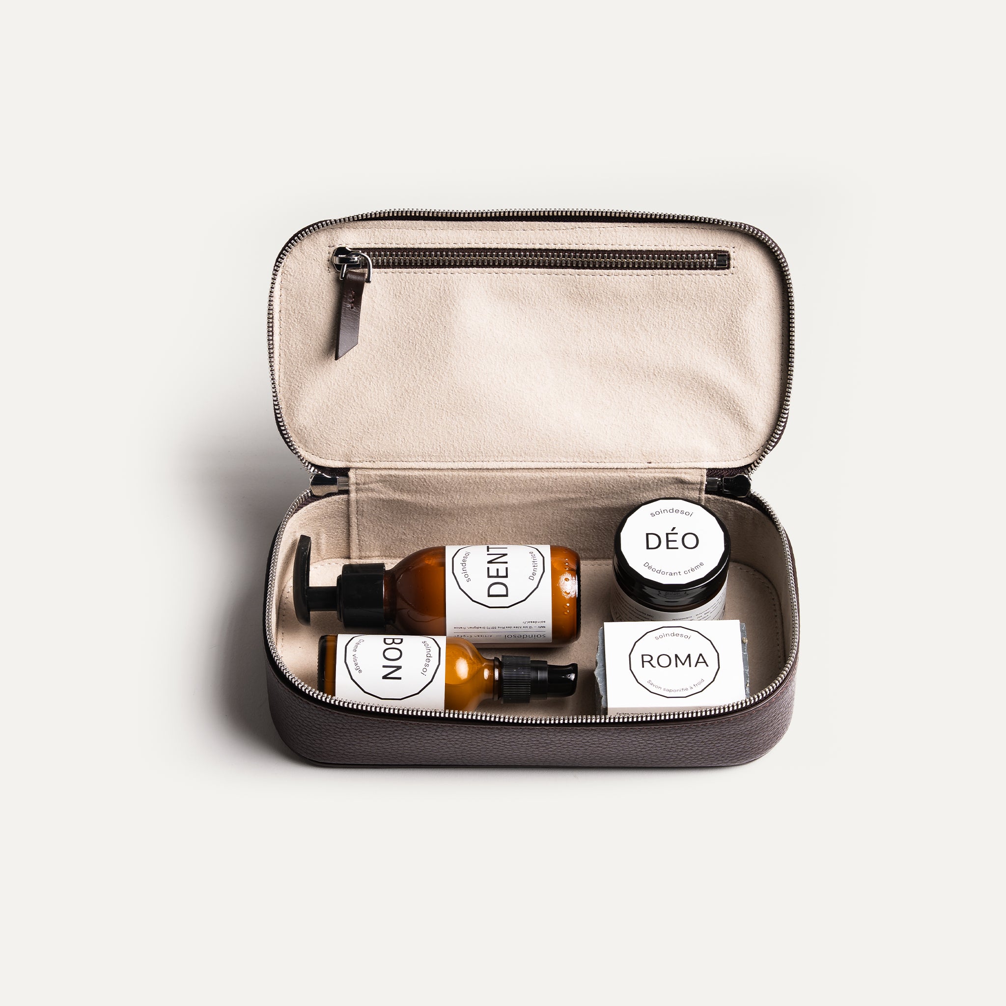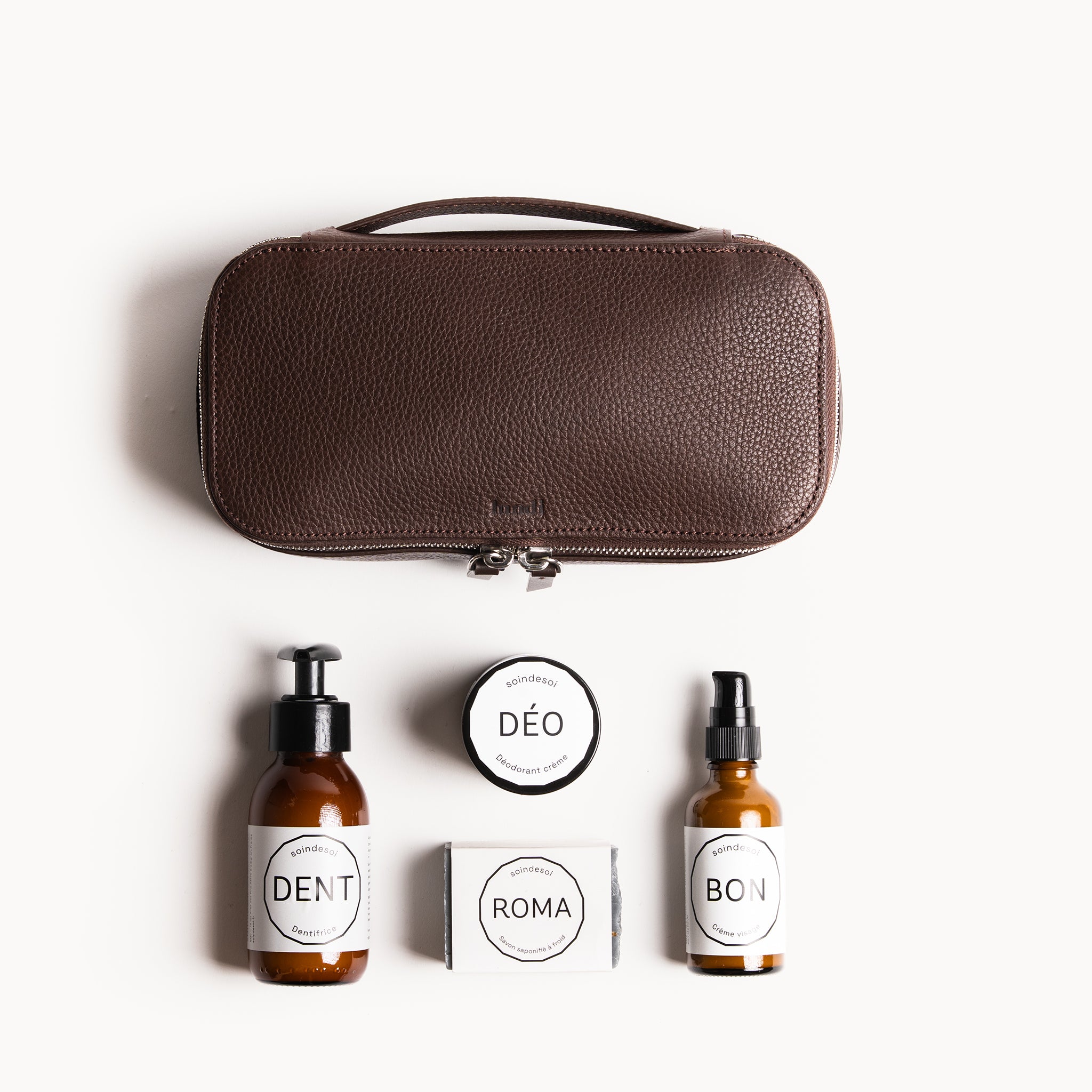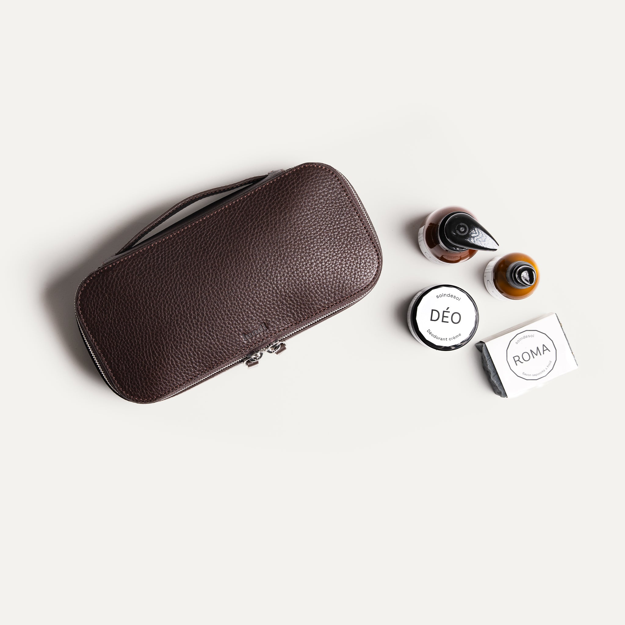 Cette trousse a été pensée pour l’homme en quête de simplicité, de raffinement et de soins naturels. En voyage ou au quotidien, elle accompagne les gestes essentiels avec élégance grâce à une trousse compacte, réalisée dans notre cuir au tannage semi-végétal.