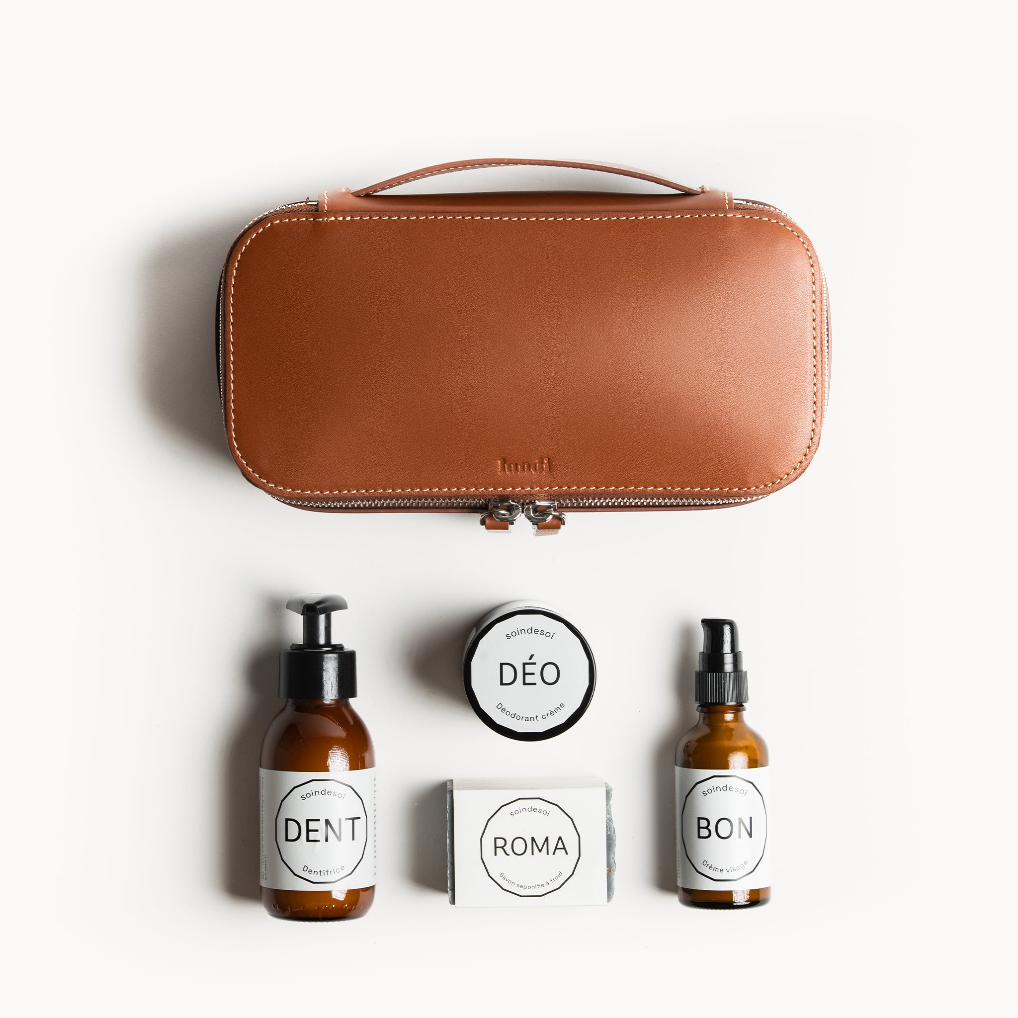 Plongez dans une routine de soin conçue pour l’homme d’aujourd’hui, où élégance et naturalité se rencontrent. Le pack Soin de Soi × lundi associe une trousse de toilette en cuir grainé ou lisse, disponible en quatre coloris raffinés — à des soins bio pour homme pensés pour durer et sublimer les gestes du quotidien.