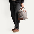 Ce modèle est confectionné dans une toile de coton déperlante grise, associée à notre cuir lisse cognac au tannage semi-végétal. Cette combinaison de matières offre souplesse, durabilité et un style intemporel. Le cuir développera une belle patine avec le temps, rendant chaque pièce unique.
