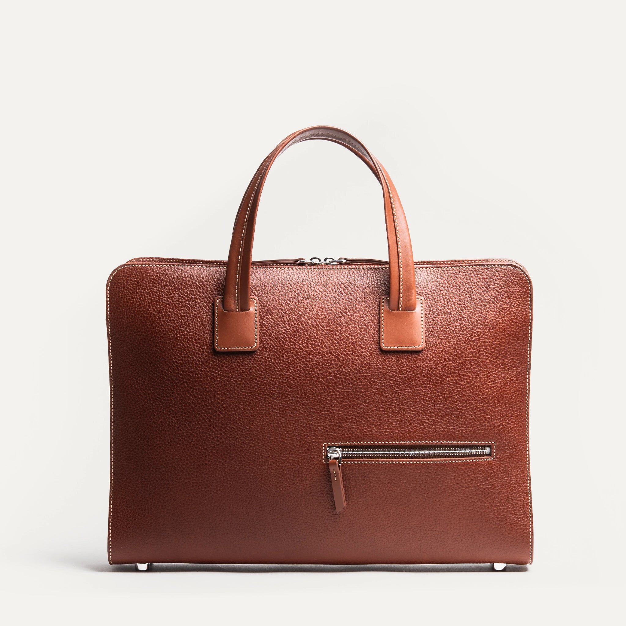 Entièrement réalisé en cuir grainé au tannage semi-végétal, le sac offre une texture régulière, dense, pensée pour durer. Le grain capte la lumière sans brillance excessive et donne au Cognac une profondeur vivante. Avec l’usage, la teinte se nuance, se patine, gagne en caractère.