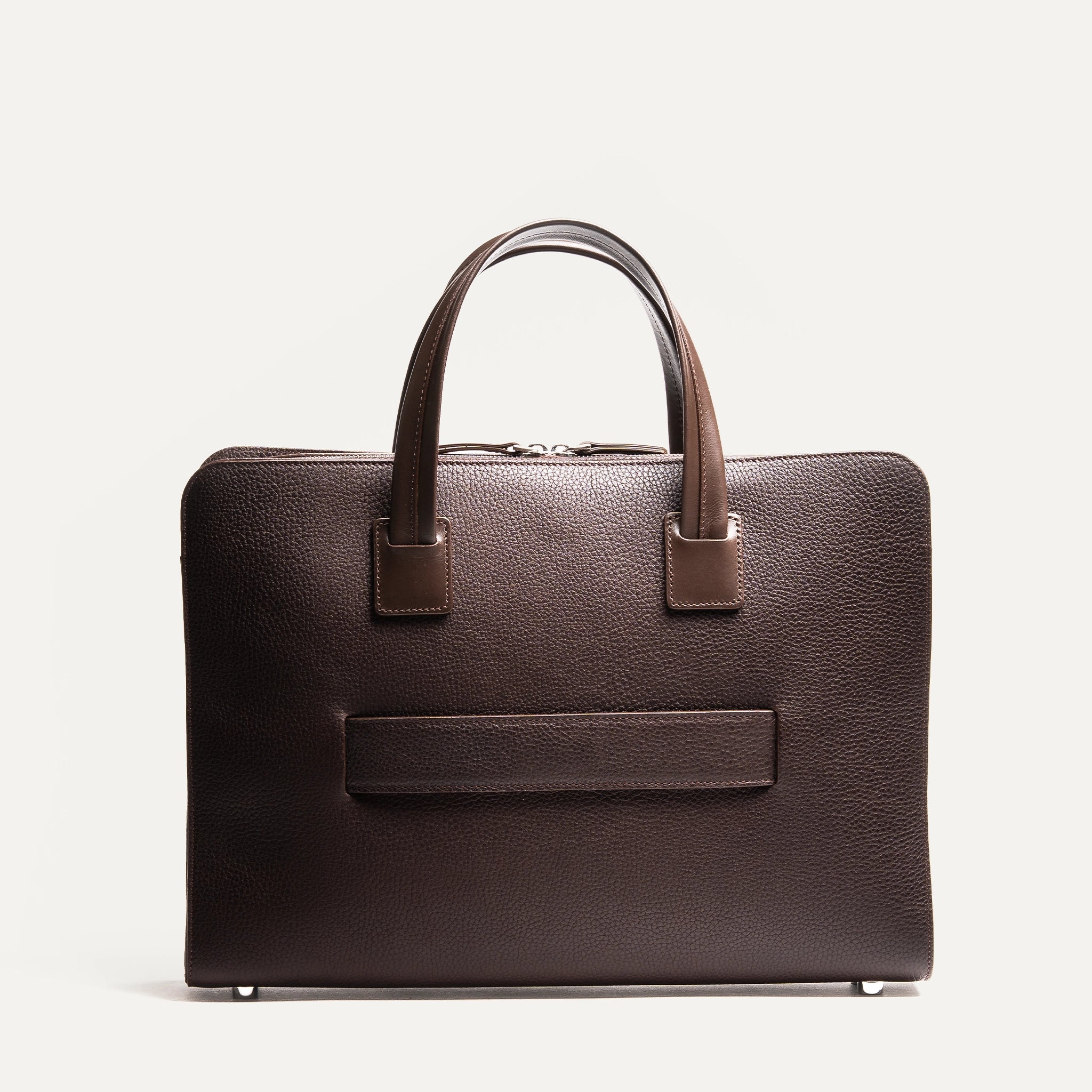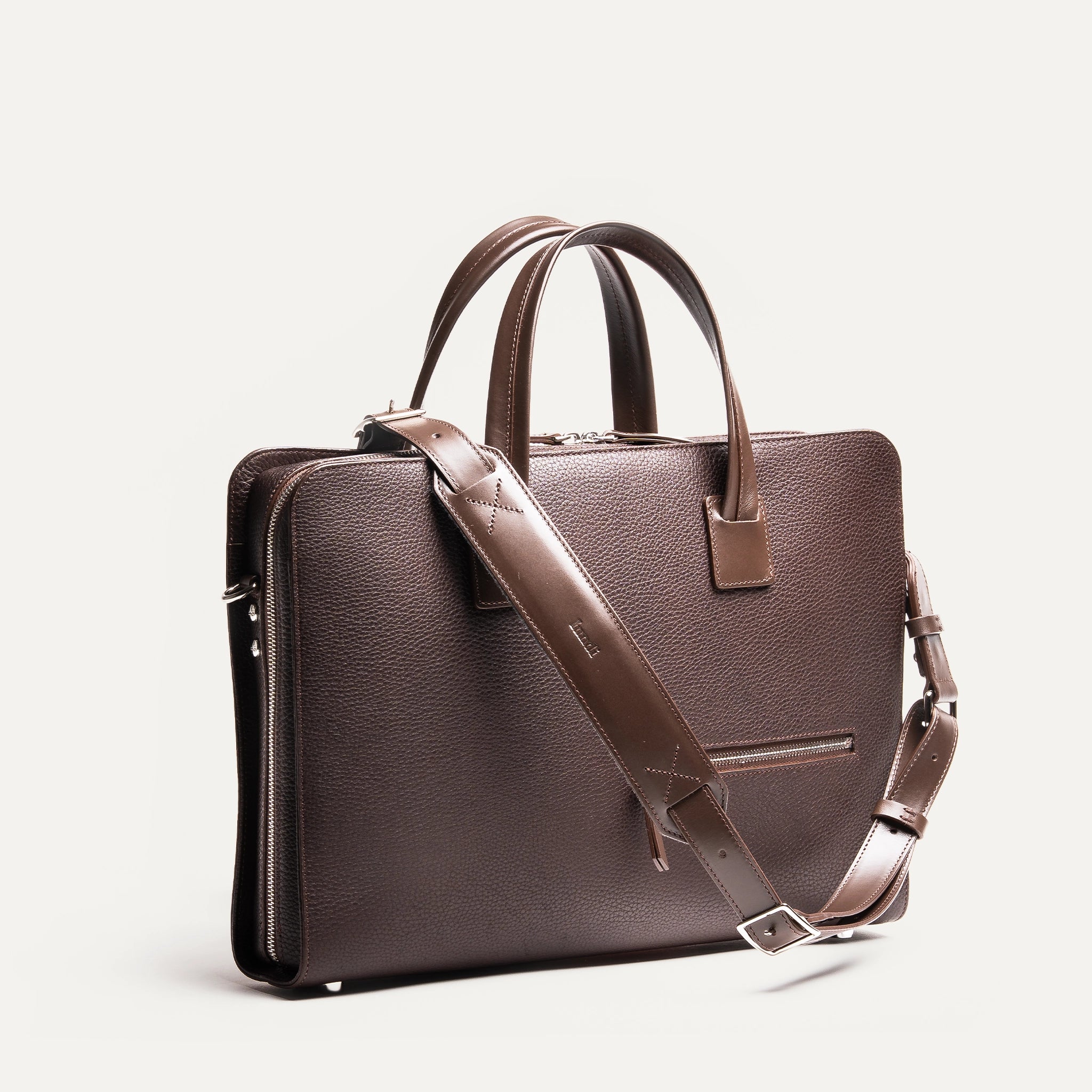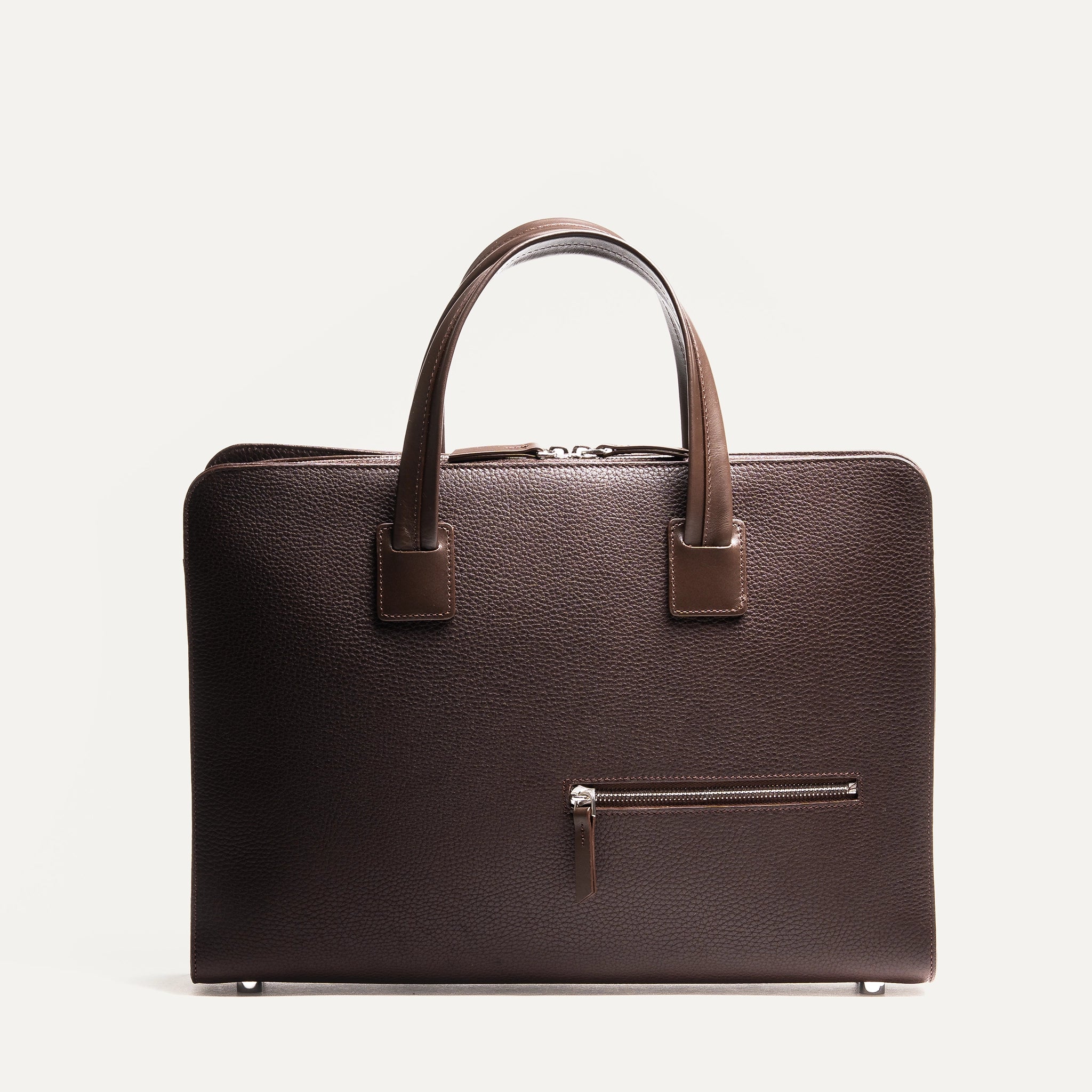 Entièrement réalisé en cuir grainé au tannage semi-végétal, le modèle exprime toute la force de la matière. Le grain régulier donne du relief sans excès, structure la surface et renforce la sensation de robustesse. Le marron foncé apporte une alternative subtile au noir : tout aussi formel, mais plus nuancé, plus vivant.