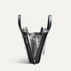 Les panneaux avant et arrière, comme les côtés du sac, sont réalisés en cuir grainé noir. Un grain régulier, dense, qui capte la lumière sans brillance excessive. Le toucher est plus structuré, plus franc. Le rendu visuel est homogène, profond, résolument contemporain.