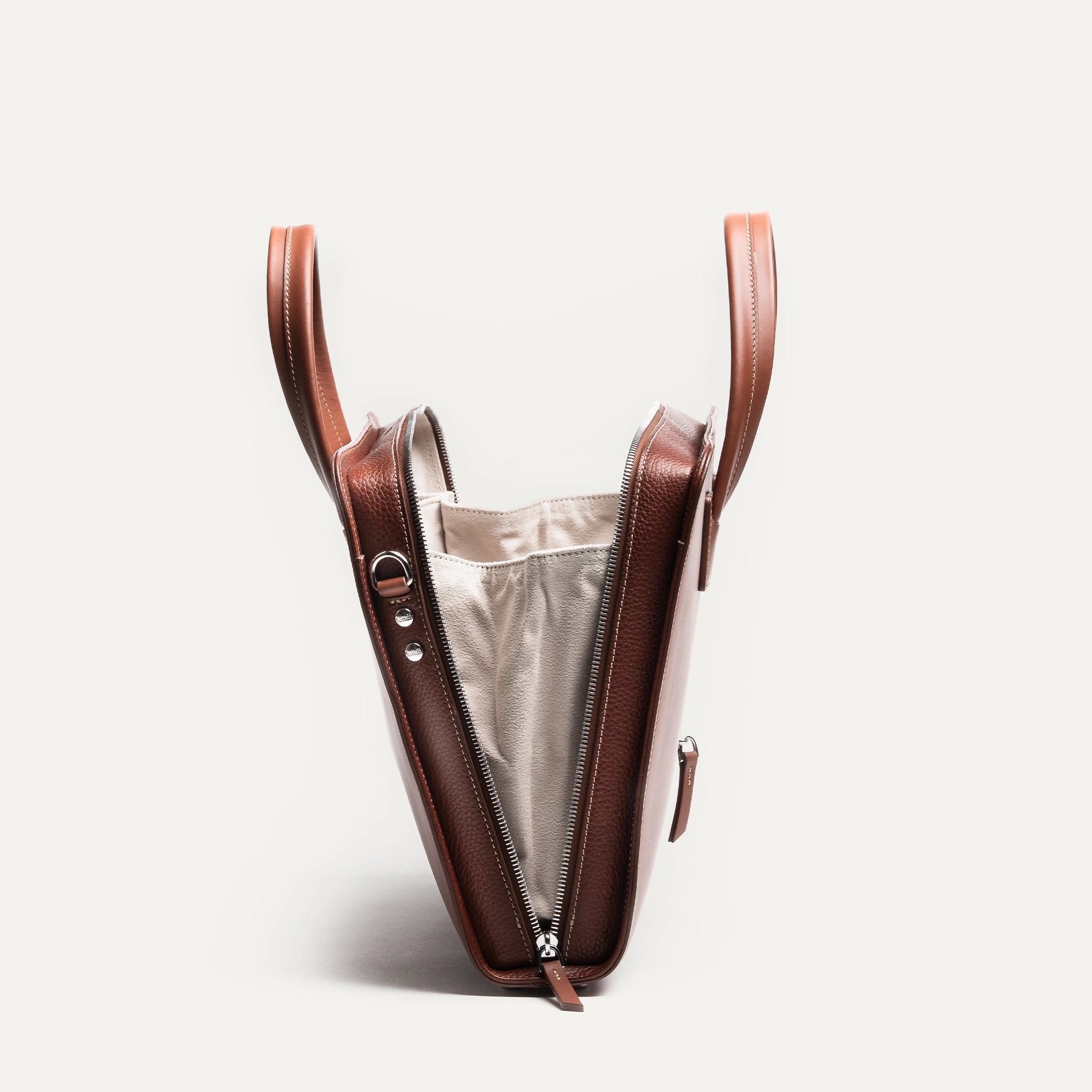 Le cuir lisse cognac, utilisé sur les panneaux avant et arrière, offre une surface nette, presque lumineuse. Sa main est souple, dense, précise. Les côtés en cuir grainé cognac apportent texture et résistance aux zones sollicitées. Cette combinaison crée un équilibre subtil entre élégance et robustesse.