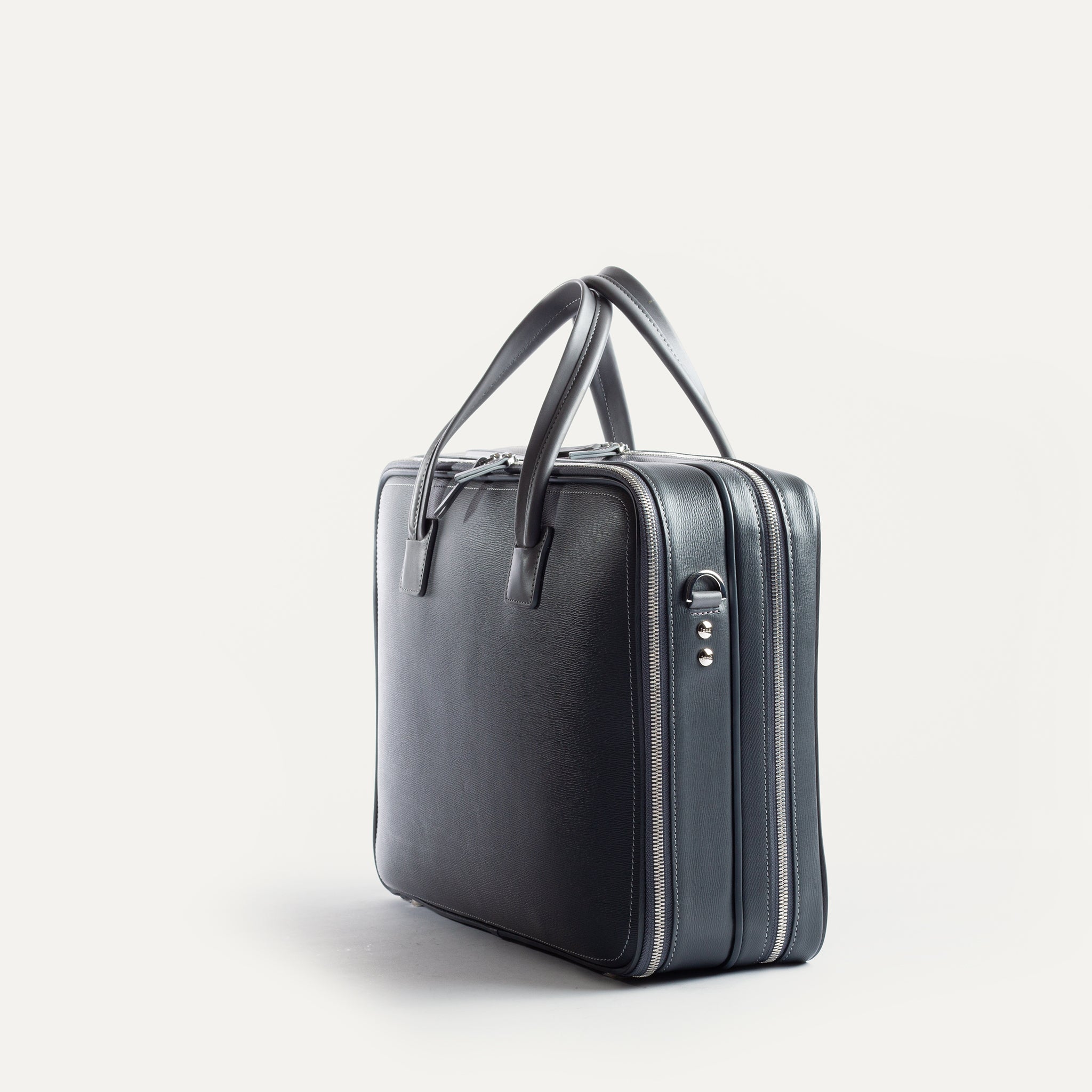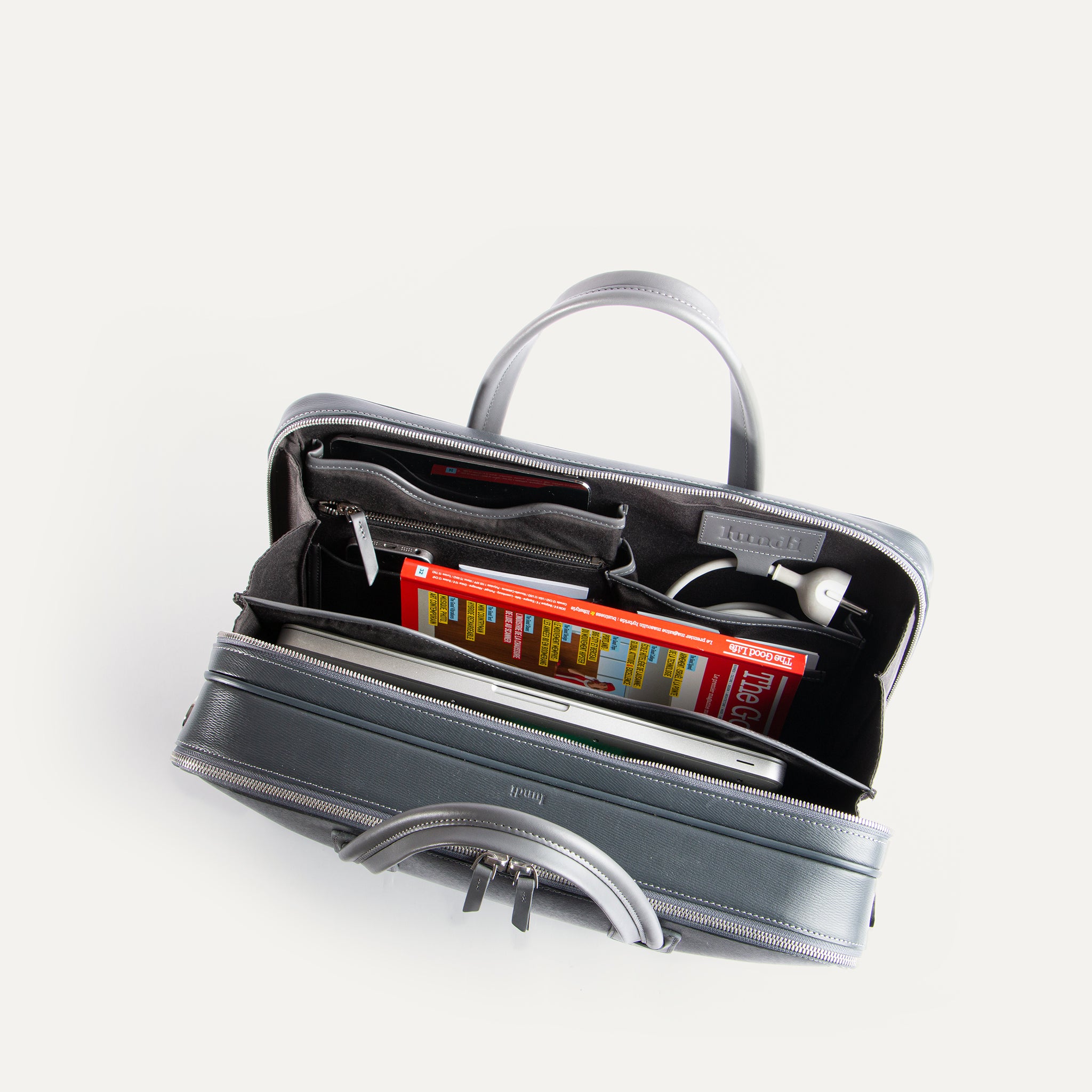 Cette version de notre sac 36 heures est fabriquée dans notre cuir embossé, décliné dans sa version gris foncé. Une couleur dense et satinée que nous associons avec le gris clair de notre cuir lisse, un cuir tanné avec des produits naturels.