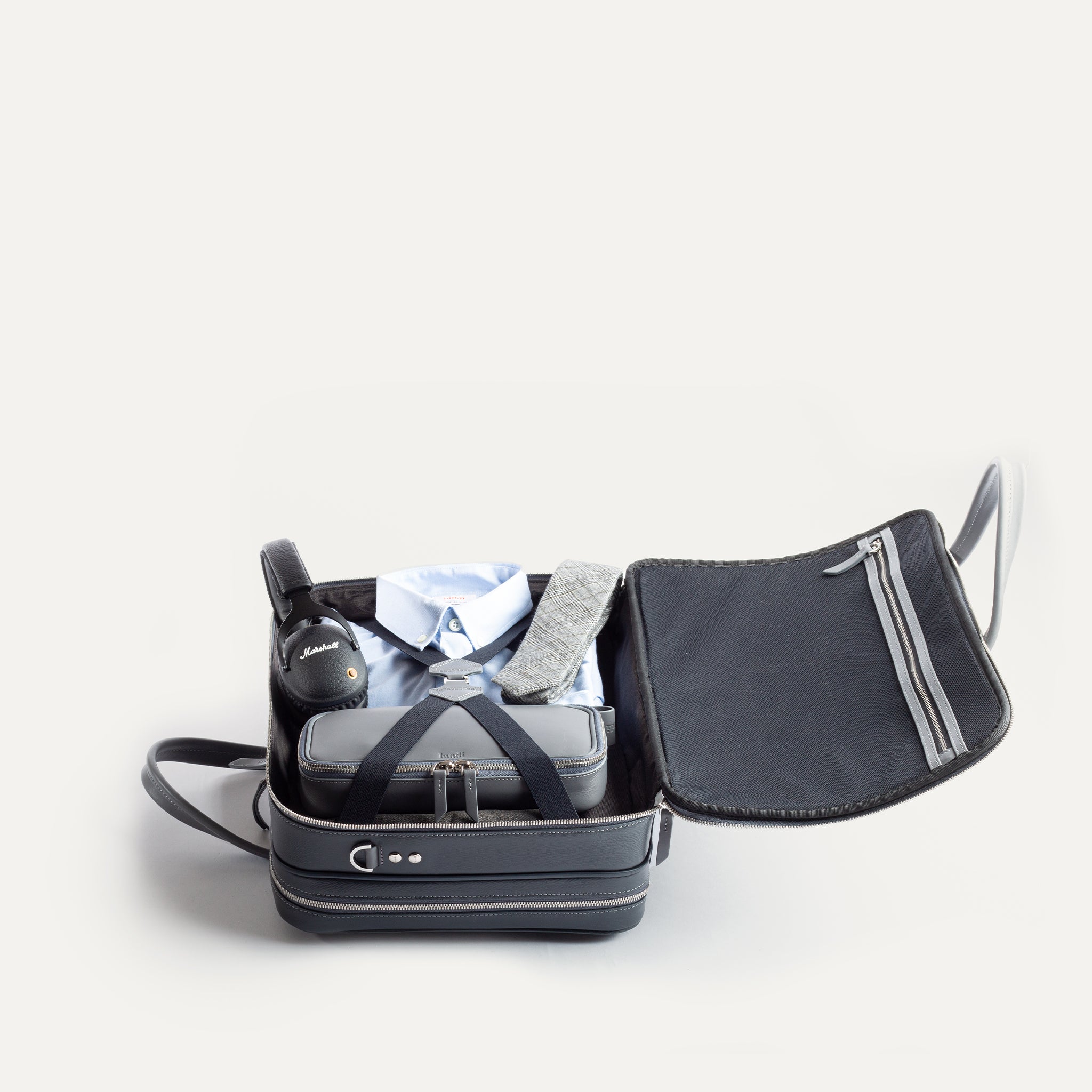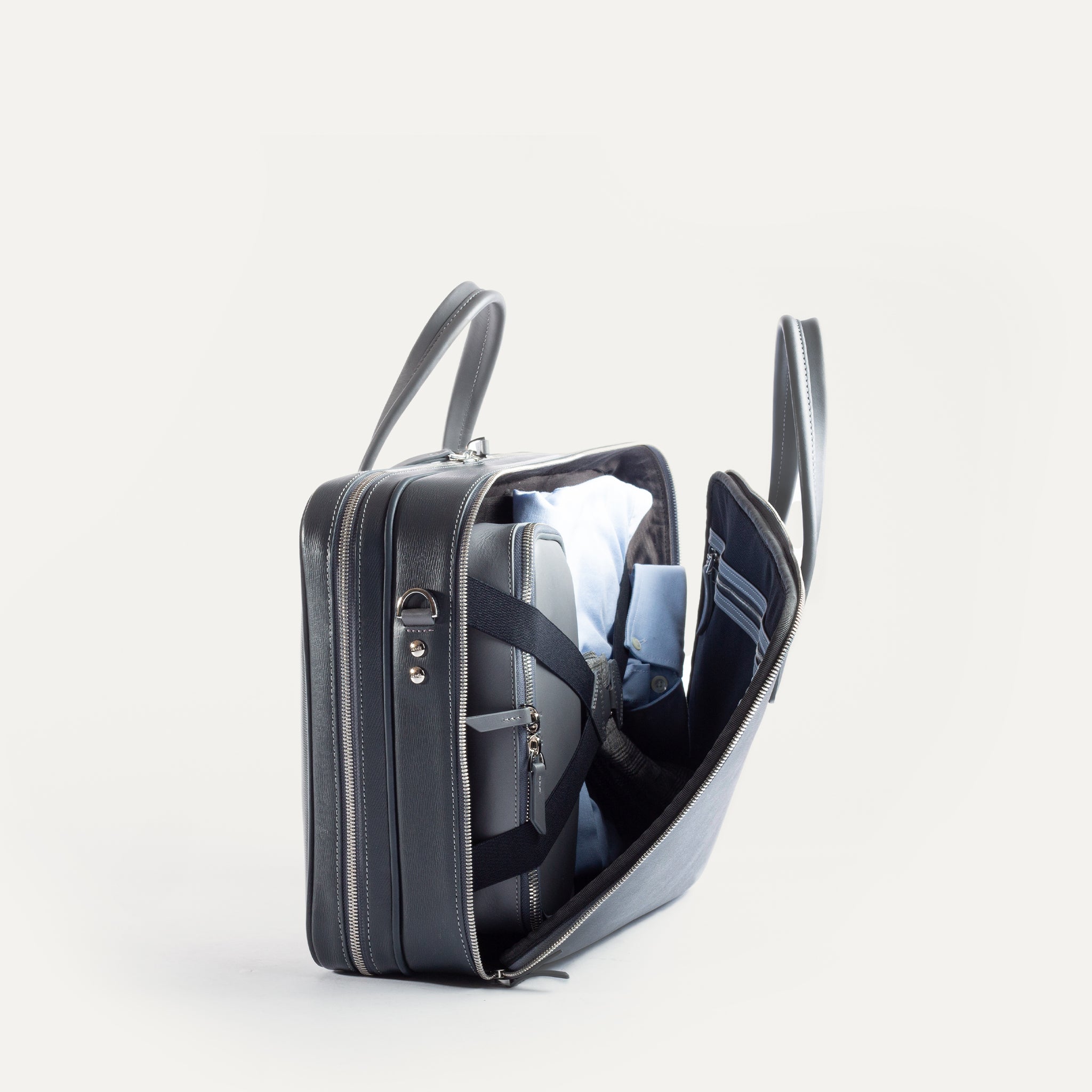 Ce sac 36 heures propose un design épuré, avec simplement une poche extérieure idéale pour venir y glisser son passeport. Cette sobriété du design cache une fonctionnalité poussée dans ses moindres détails : 2 compartiments distincts permettront de ranger à la fois ses affaires de bureau (ordinateur, tablette, câbles, chargeur, documents A4...) et ses vêtements (chemise, pantalon, t-shirt, cravate...). Enfin, vous pourrez utiliser la trousse de toilette JULIET ou GINA dont les dimensions ont été étudiées pour parfaitement s'intégrer à ce 36 heures.
